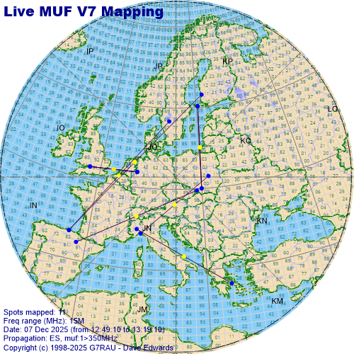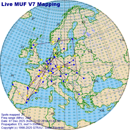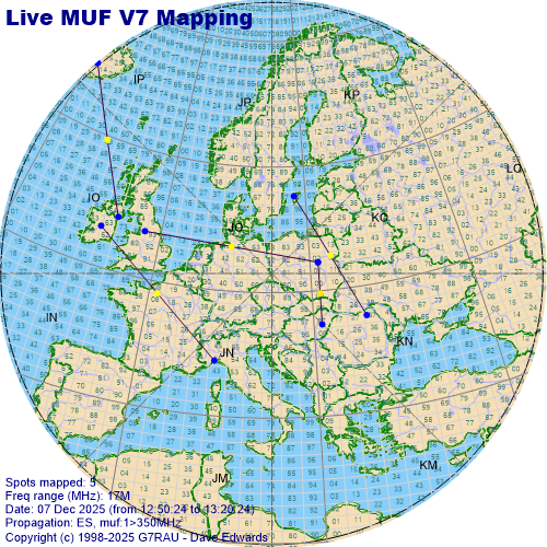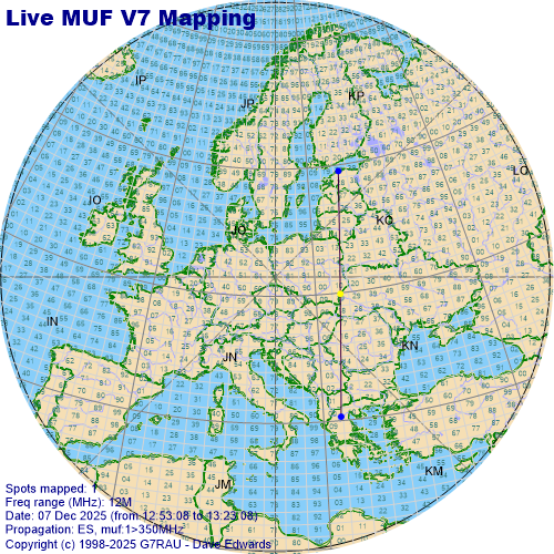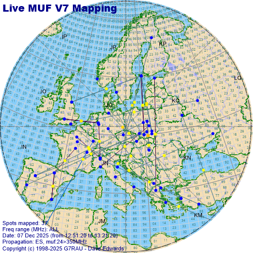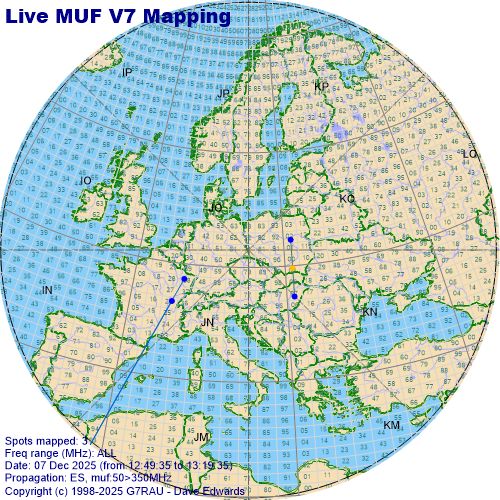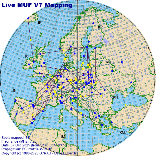 QUI SOPRA: Grafico (aggiornato ogni 15 minuti) della frequenza critica dello strato Es sporadico SOPRA L'ITALIA . La frequenza massima utilizzabile di uno strato Es sporadico, MUFEs è circa 5,319 volte la frequenza critica INDICATA